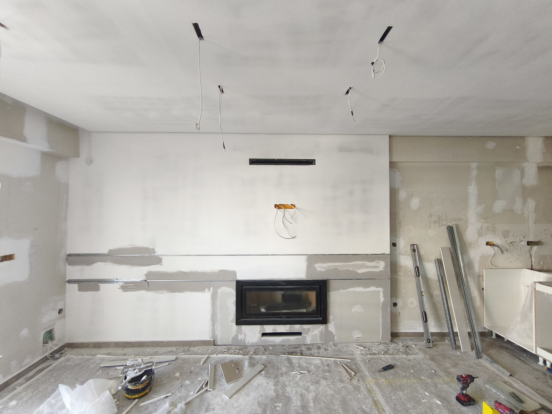 Ανακαίνιση διαμερίσματος 70 τετραγωνικών στο Ελληνικό.  Δημιουργήθηκαν επενδύσεις, κρυφοί φωτισμοί,  ψευδοροφές, χωνευτά σποτάκια οροφής, ράγα οροφής και ντύσιμο τζακιού.
